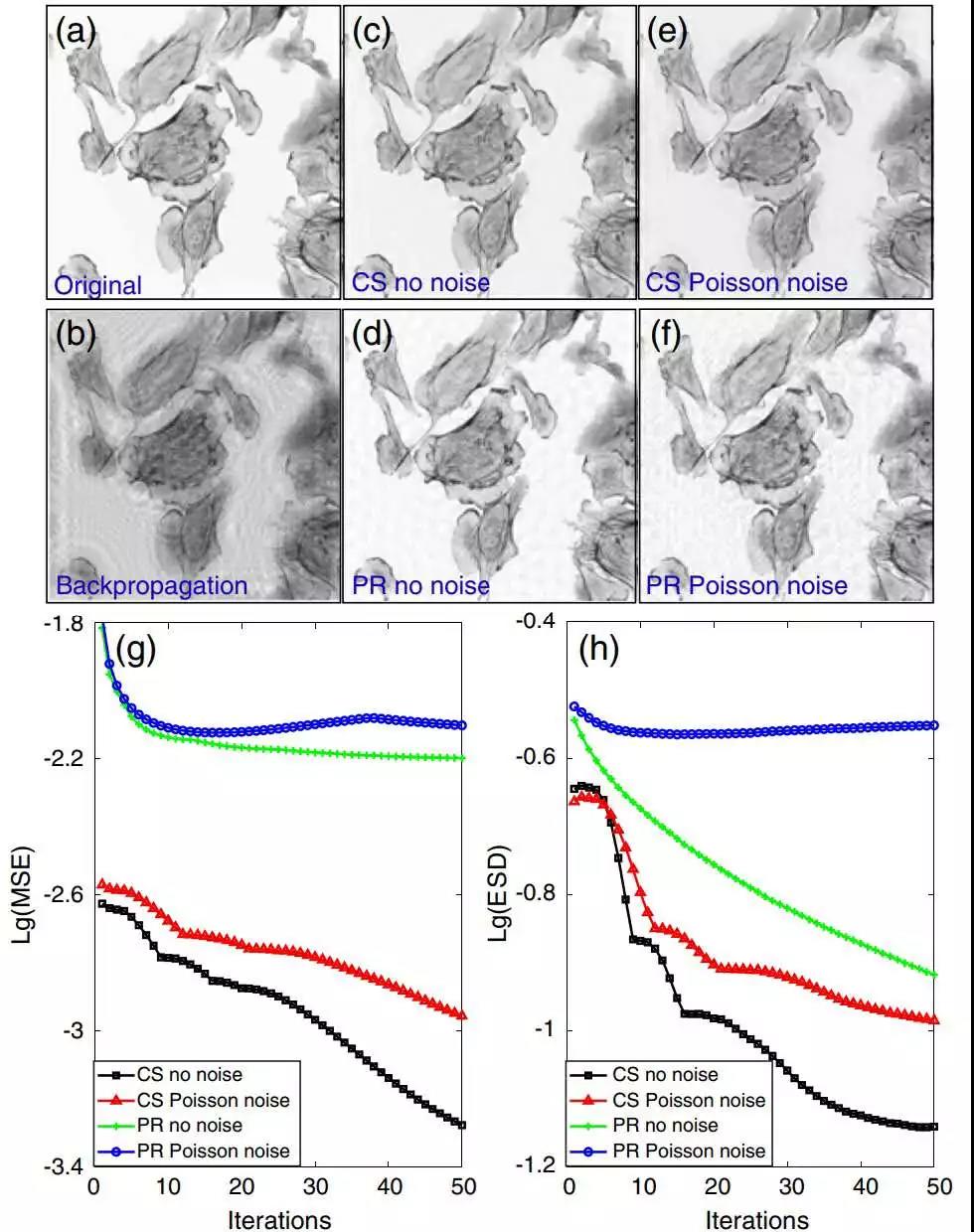 (e,f)在50次迭代后通过CS和PR从泊松分布噪声全息图重构;