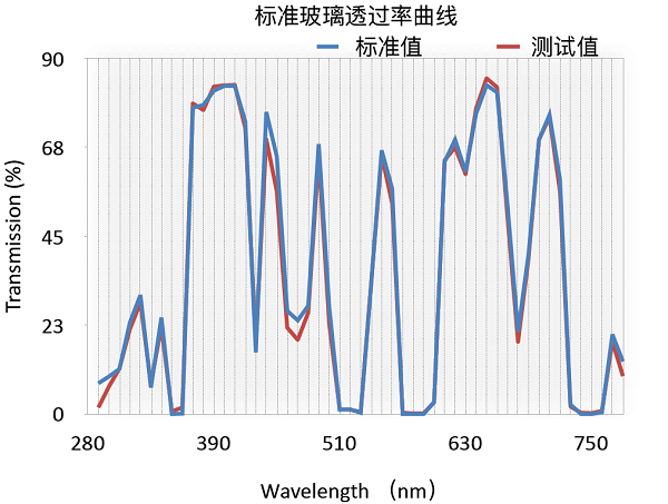 测试结果       采用推荐配置测得标准镜片透射率,插值法(origin)计算光谱曲线中对应标准透射率,波长间隔为 10nm。